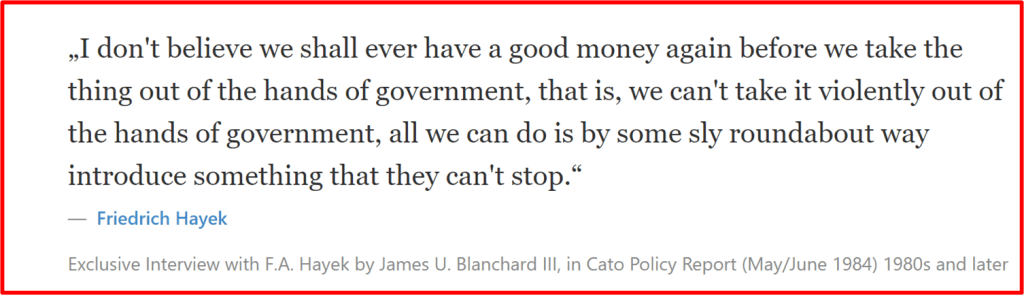 It’s sad Mr. Hayek isn’t alive today to see that Bitcoin is his sly and roundabout way to “take the thing out of the hands of government“. And they can’t stop it.