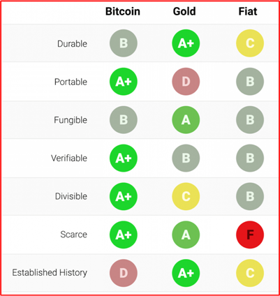 I love the following table and I’ve posted it before. I’m going to keep posting it every so-often because it really shows how Bitcoin wins the “ility” wars against gold, which in-turn wins the war against the worst form of money – sovereign fiat paper.