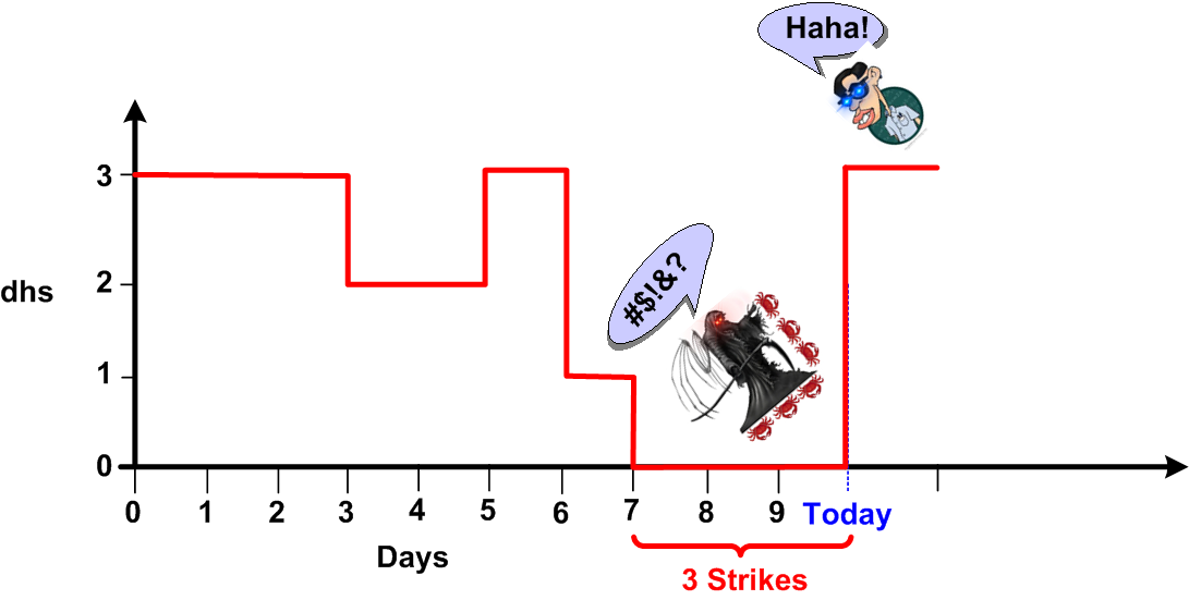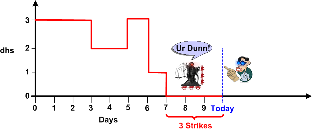 After being out of sorts for a bit, I’m back bloggin’ again cuz ya never know when the fit is gonna hit the shan. So, here’s a simple state machine model of BD00’s daily goal seeking behavior. The goal is to sequentially enter/exit each health-advancing state without experiencing an SDFFR event that triggers an early exit with a suboptimal daily physical health score (less than 3).