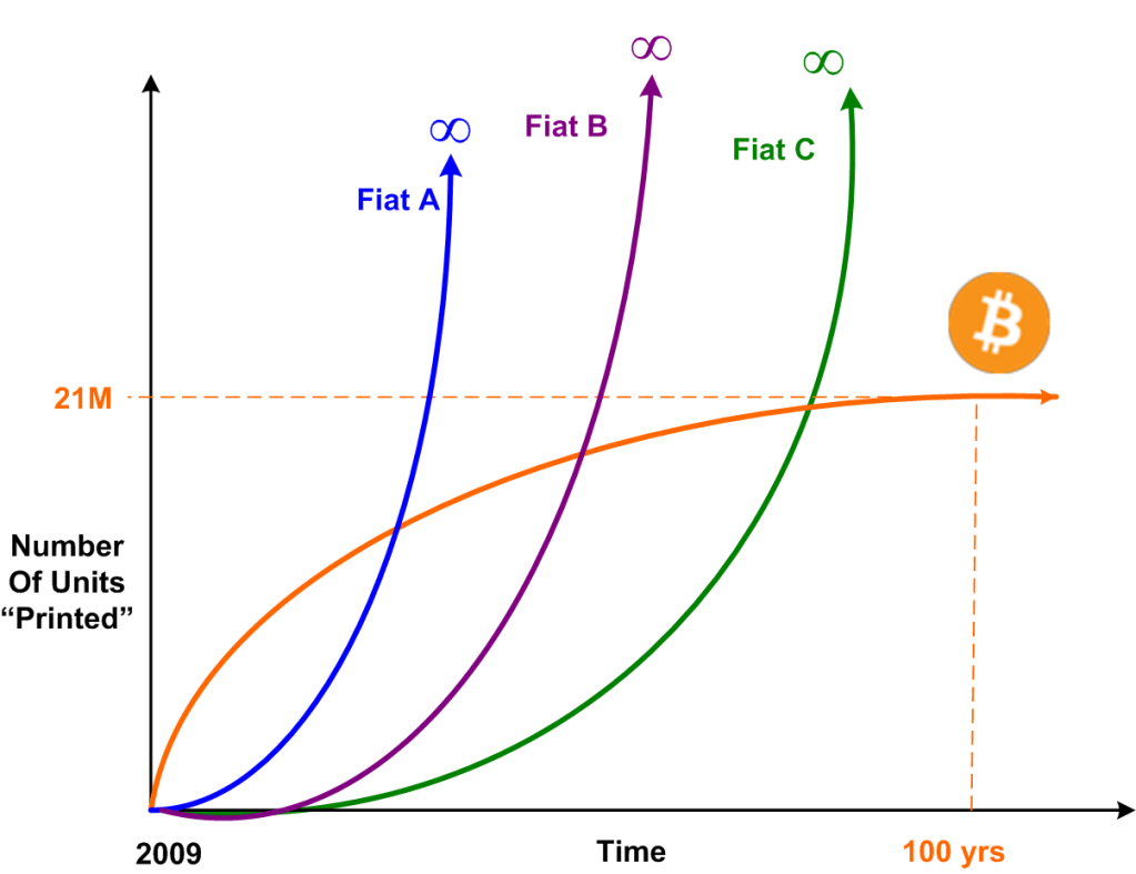 So, how does Bitcoin break the mold on the exponential fiat model of destruction? Bitcoin’s 21M hard limit may (and should) convince some fiat-based nation-states to assume fiscal responsibility and bend their curves to the right to avoid a massive loss via capital flight into Bitcoin and other stores of value.