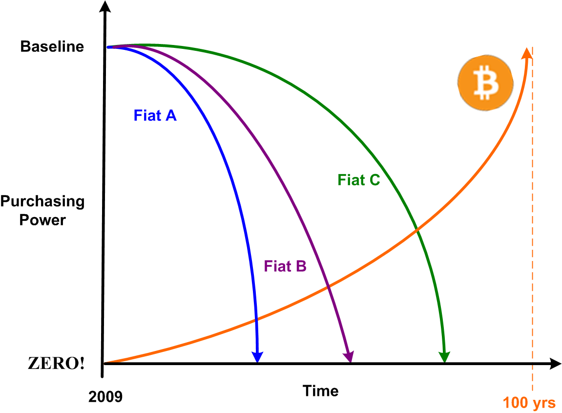 As the money printers go “burrrrrrr” and the money supply gets exponentially inflated like that guy in the Monty Python movie, the purchasing power of each fiat unit decreases until the system implodes. I read, in one of the many fine Bitcoin books, that no known fiat-based systems have ever survived 100 years.
