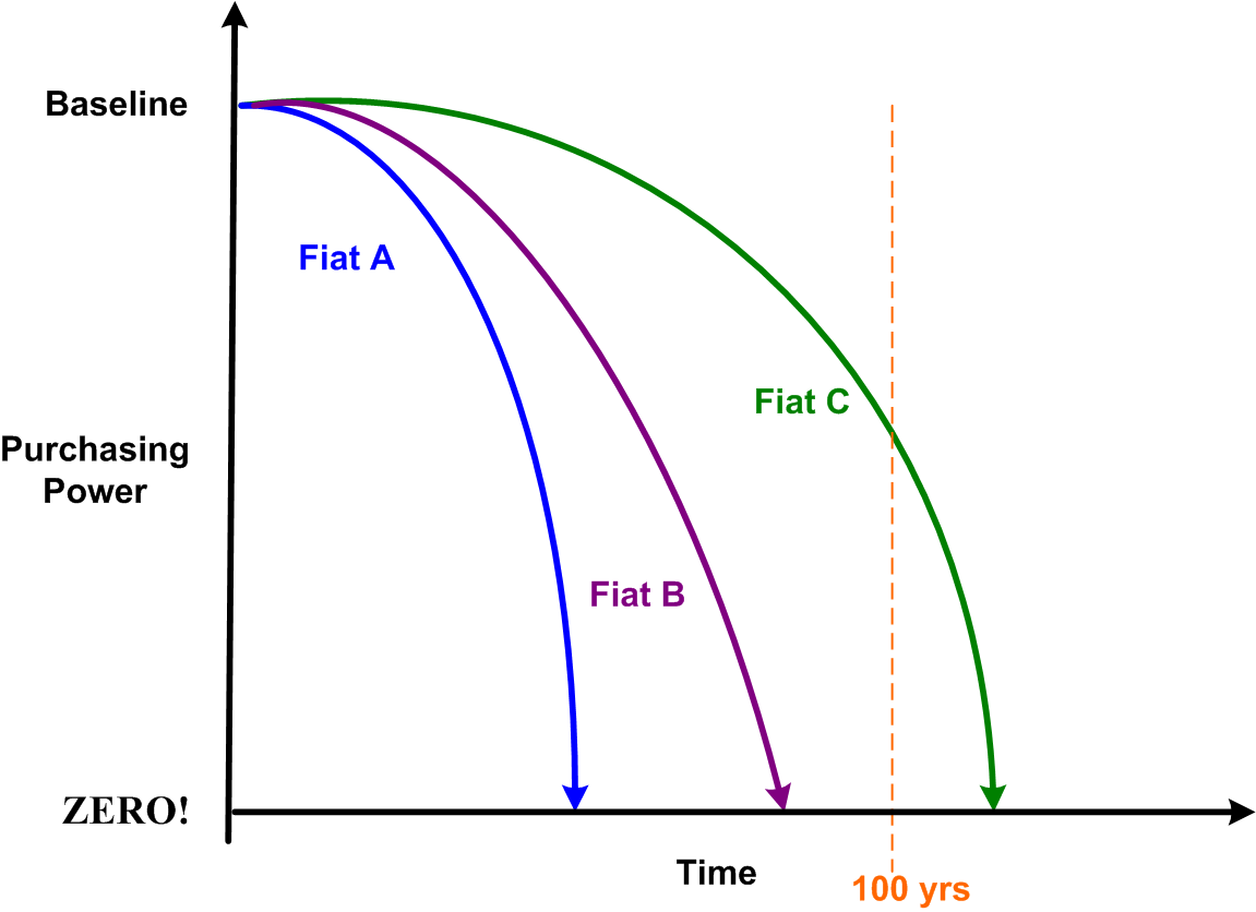 With that out of the way, the graphic below shows what happens in all fiat-based, nation-states over time. Since politicians are too chicken to raise taxes for projects they believe will help the country prosper, they continuously borrow money with no intention of ever paying it back. Wouldn’t it be nice if citizens could borrow money without ever having to pay it back? The politicians borrow money from the public and, when the public doesn’t want to part with their fiat because of “trust” issues, the central bank waltzes in and prints money out of thin air to soak up the unwanted debt. Wouldn’t it be nice if citizens could print their own money out of thin air whenever they wanted instead of having to work their asses off for it?