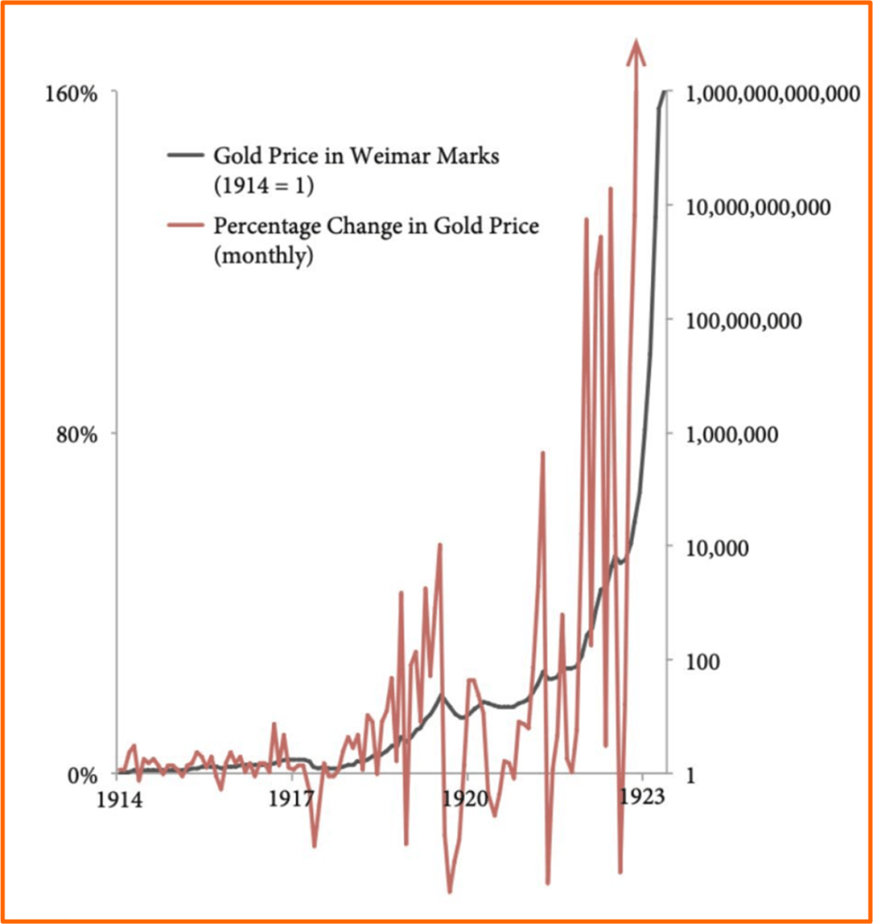But wait, nothing is as it seems! Check out this graph of gold’s price volatility during the hyperinflation-ization of Weimar Germany before and after WWI.
