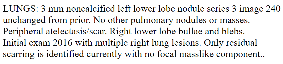 In prep for my upcoming tri-monthly scanxiety day, I re-reviewed my March chest/abdomen/pelvis CT scan report. I did it so I can once again fake being intelligent at the follow up with my oncologist. The “lungs” section of the report is presented below for your HIPAA reading pleasure.