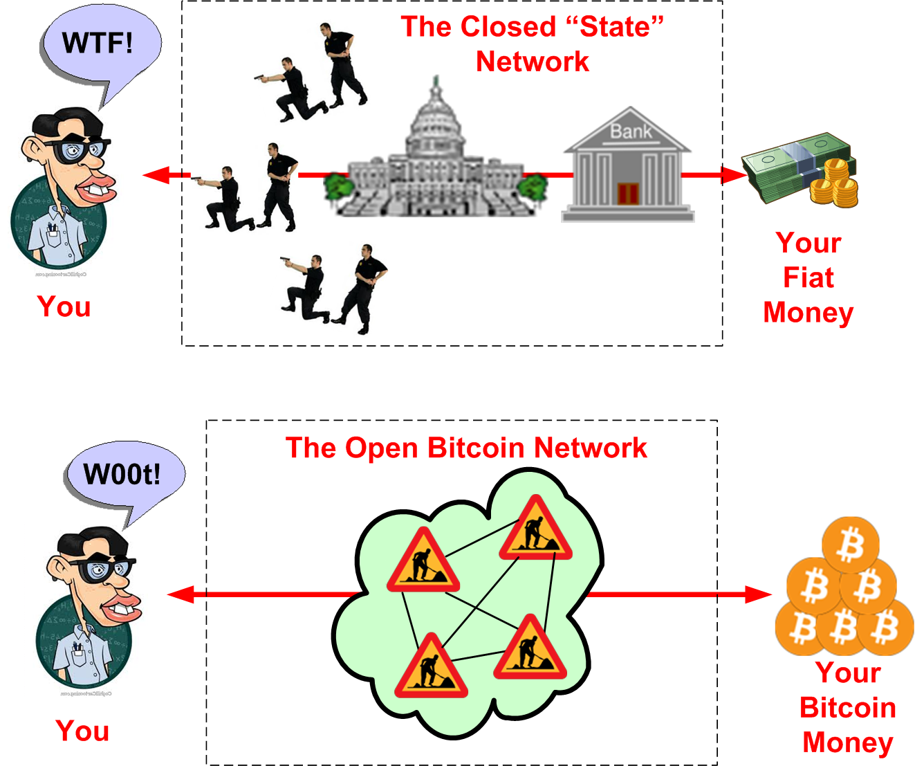 they will abandon Bitcoin for the old, rigged, fiat system or worse, a centralized shitcoin deceptively promoting itself as decentralized, or, equivalently, a DINO (Decentralized In Name Only). Whereas DINO shitcoins primarily exist to make the peeps at the top of their centralized pyramids rich, Bitcoin exists for one audacious reason: to give every person on earth an equal chance of participating in unobstructed commerce to help bootstrap themselves out of poverty.