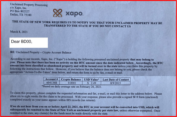 So here we are 5 years later and I get the following letter from Xapo…