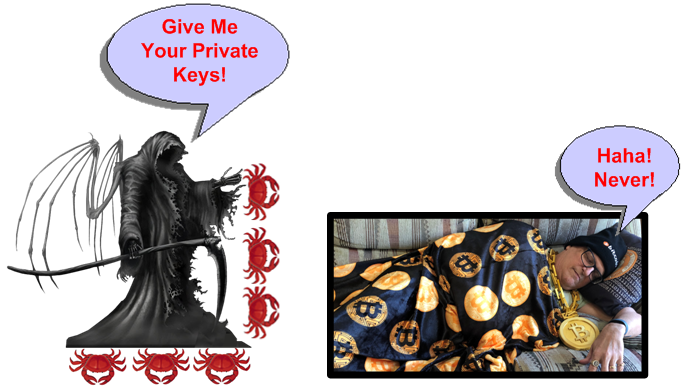 While posing for my future wake, I sensed the ice cold presence of the dastardly Emperor Of All Maladies in the room. The repugnant monster has a dilemma on his creaky, boney hands when it comes to BD00. He doesn’t want to drag BD00 off to hell until he gets those claws on his Bitcoin private keys. But BD00 will never give them up. They’re gonna burn with him in hell.