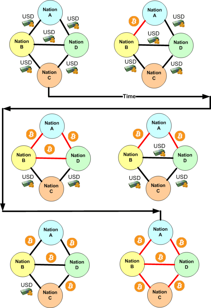 As a US citizen, it gives me no pleasure to graphically show you the impending, step-by-step, Bitcoin usurping of the USD as the medium-of-exchange for international trade.