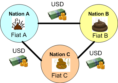 The figure below shows the preference for USD over local crap currencies when goods are traded between nations. Even though every country (including the US) debases their fiat currency by printing more of it whenever it’s politically convenient, the relative stability of the USD has kept it in the pole position for decades.