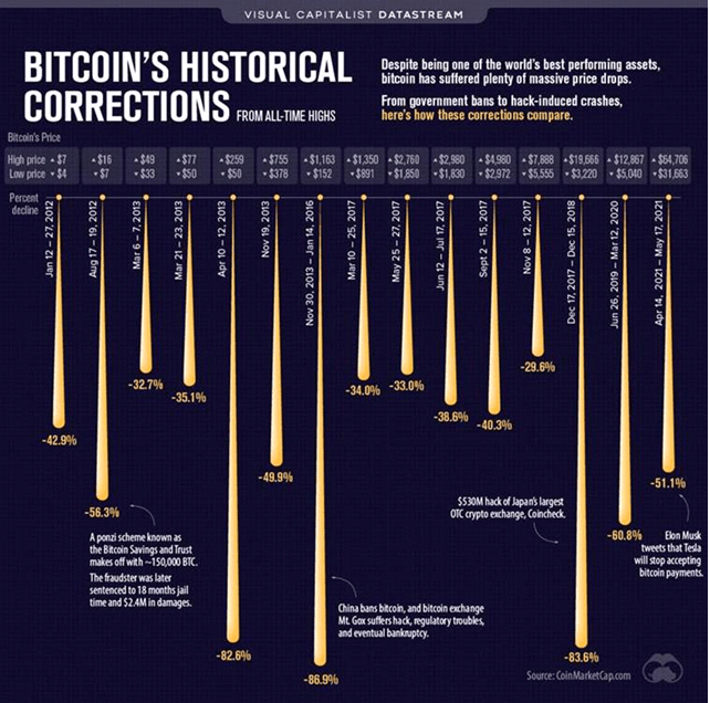 As far as I know, no other asset class has ever gone from 0 to $1T in market capitalization as fast as the king of crypto. The tradeoff for this high growth rate has been the “V” word – volatility. The scary chart below clearly shows the Bitcoin schizophrenic price volatility endured by HODLers through the years.