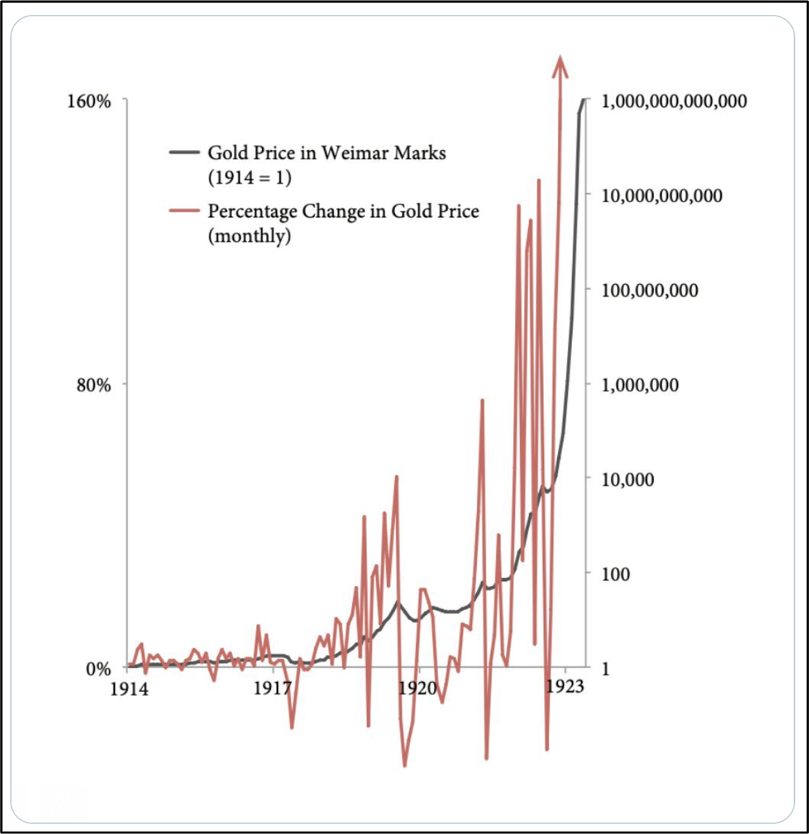 To the gold bugs who think Bitcoin’s extreme volatility disqualify it as a store of value, have a looky here. Behold the extreme volatility of your beloved shiny rocks during the hyperinflation runup in Weimar Germany.