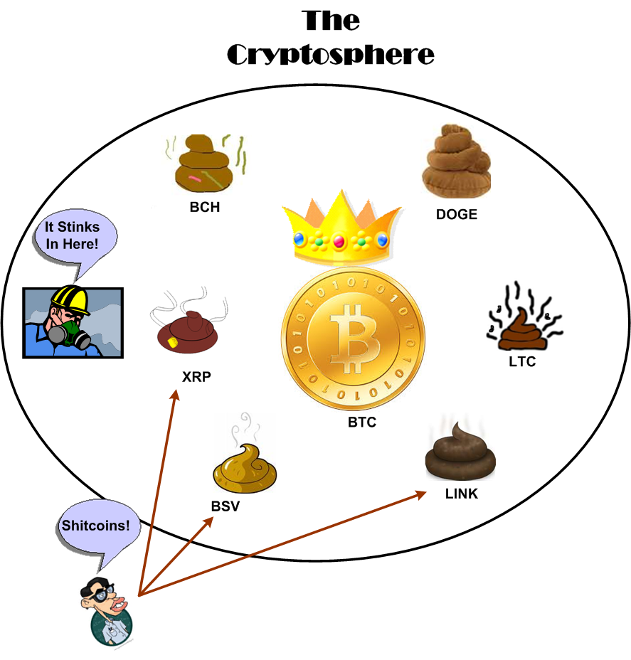 There are thousands of shitcoins polluting the cryptosphere. I chose a few of the most well known stinkers along with the immortal king of crypto to produce the following work of art…