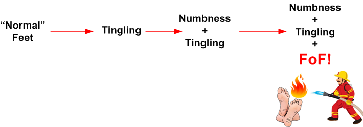 As the graphic below shows, the progression from taken-for-granted,”normal“, feet to the FoF state is an additive process. You may not believe this, but as I write this my feet are numb, tingly, and painful all at once. I don’t know if I can do anything to permanently regress back to the numbness + tingling state but I’ll keep trying new meds/supplements/topicals as I become aware of them.