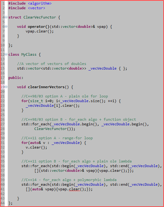 In the slide deck that Bjarne Stroustrup presented for his “Make Simple Tasks Simple” CppCon keynote speech, he walked through a progression of refactorings that reduced an (arguably) difficult-to-read, multi-line, C++98 code segment (that searches a container for an element matching a specific pattern) into an expressive, C++11 one liner: