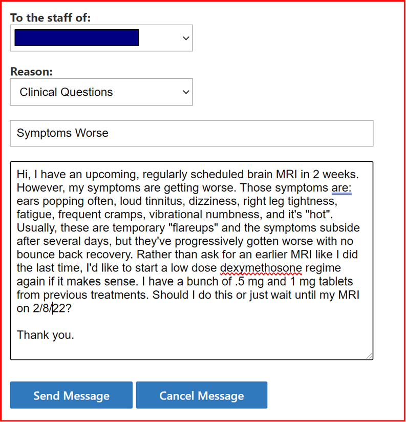 Because of the well-known cancer woes I just whined about above, I sent this S.O.S. message to my neurosurgeon’s office:
