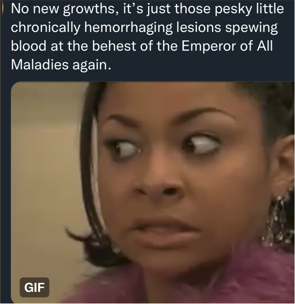 The cherry on top of my Lazarus-like experience was the MRI scan follow up with my neurosurgeon, which happened today. Good News: There are no new growths and no progression of existing tumors. Bad news: Those pesky, relentless, chronic, hemorrhaging, lesions are still working their asses off for the Emperor Of All Maladies.