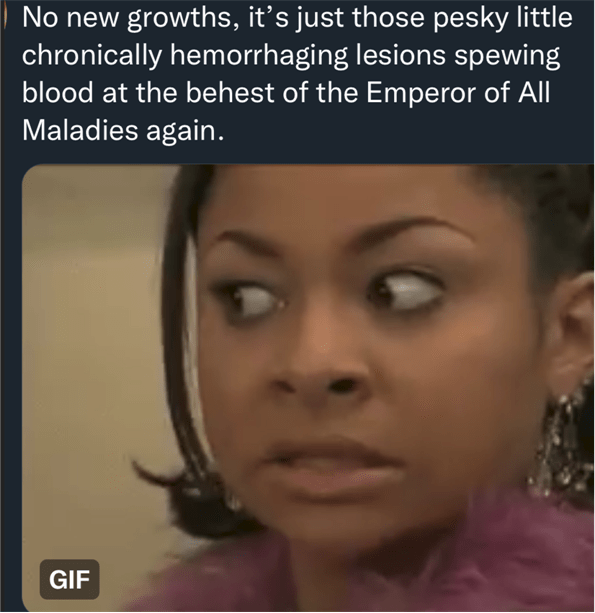 So, that’s the latest update from the battlefront in my existential war with the fucker that is… the Emperor Of All Maladies.