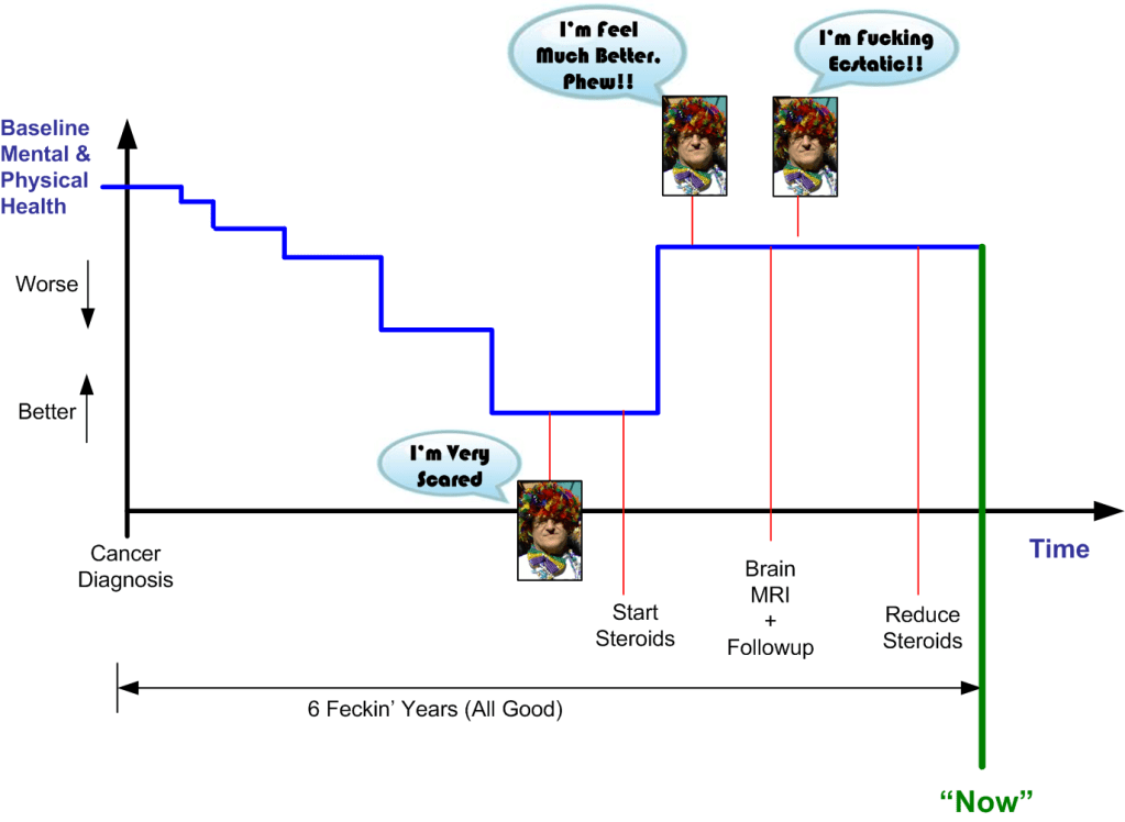 My previous post described in detail what made me start feeling very (feckin’) scared. It was the Emperor’s formidable power to insidiously inject ominous thoughts into my consciousness whenever he wants. I often fancied I was on final descent and destined for a world of pain in the near future. The steroids then kicked in and a quantum leap in my mental/physical health magically occurred. Hallelujer!