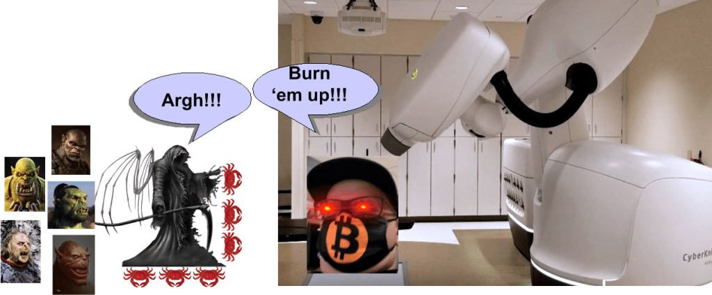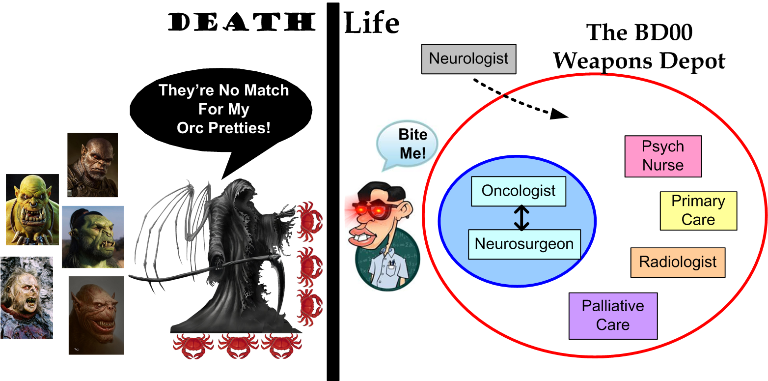 Because of this new, but not-so-surprising development, a CT/PET scan of my brain is currently being scheduled in order for my generalissimo neurosurgeon to get a high resolution look at what those fugly Orcs are doing. My trusted Cyberknife friend will probably have to be deployed yet again to burn those feckers back into their hellholes. If not, it’s either brain surgery or hospice….. just kidding. I have no idea what will happen next until it happens. lol, let’s rock!