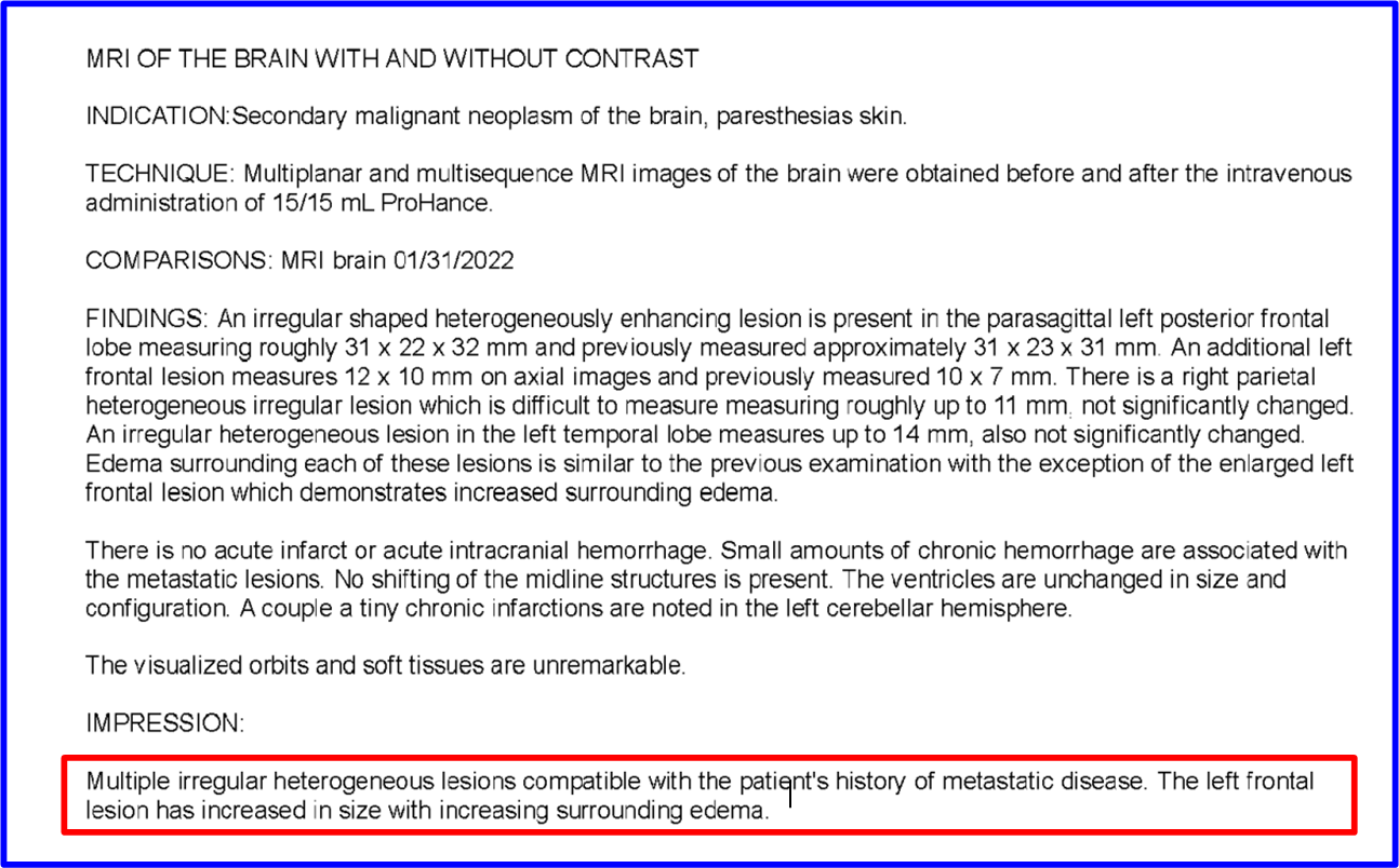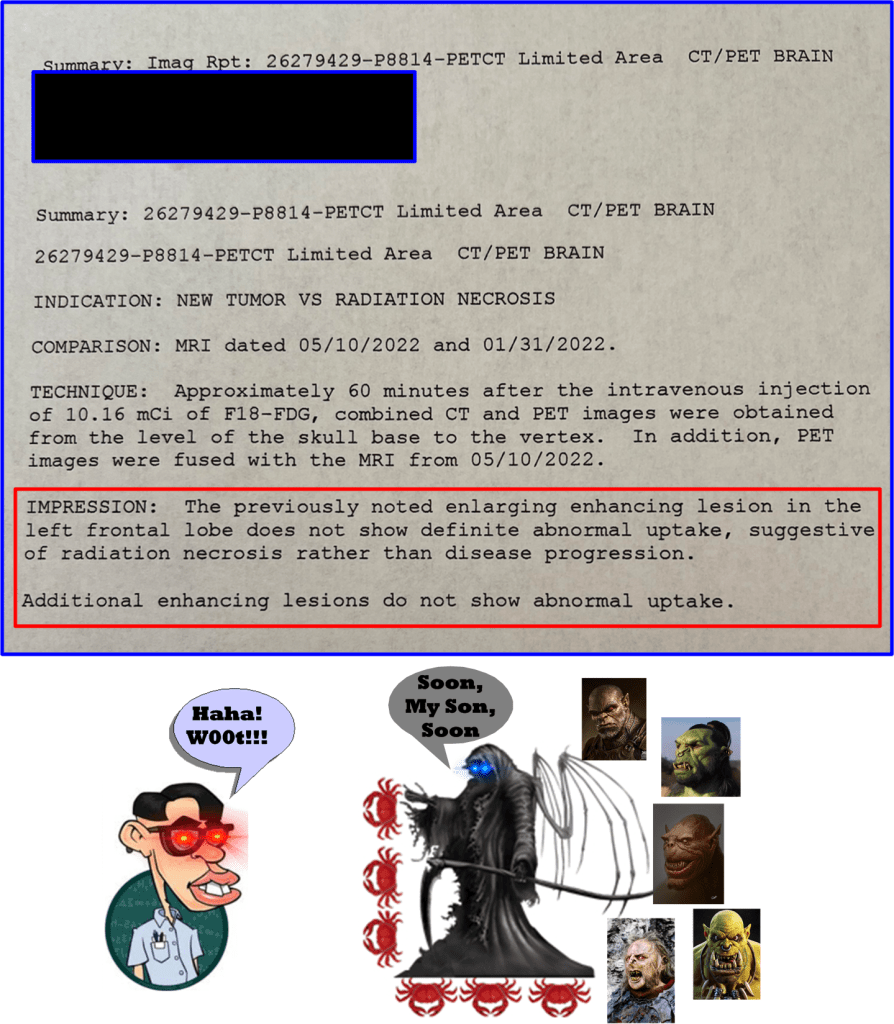Thankfully, my neurosurgeon’s instinct was wrong in this case. The cause of growth was due to radiation-induced necrosis, not because of the Orc army’s continuous murderous assaults on my physical being, i.e., tumor growth. Hallelujer for necrosis!