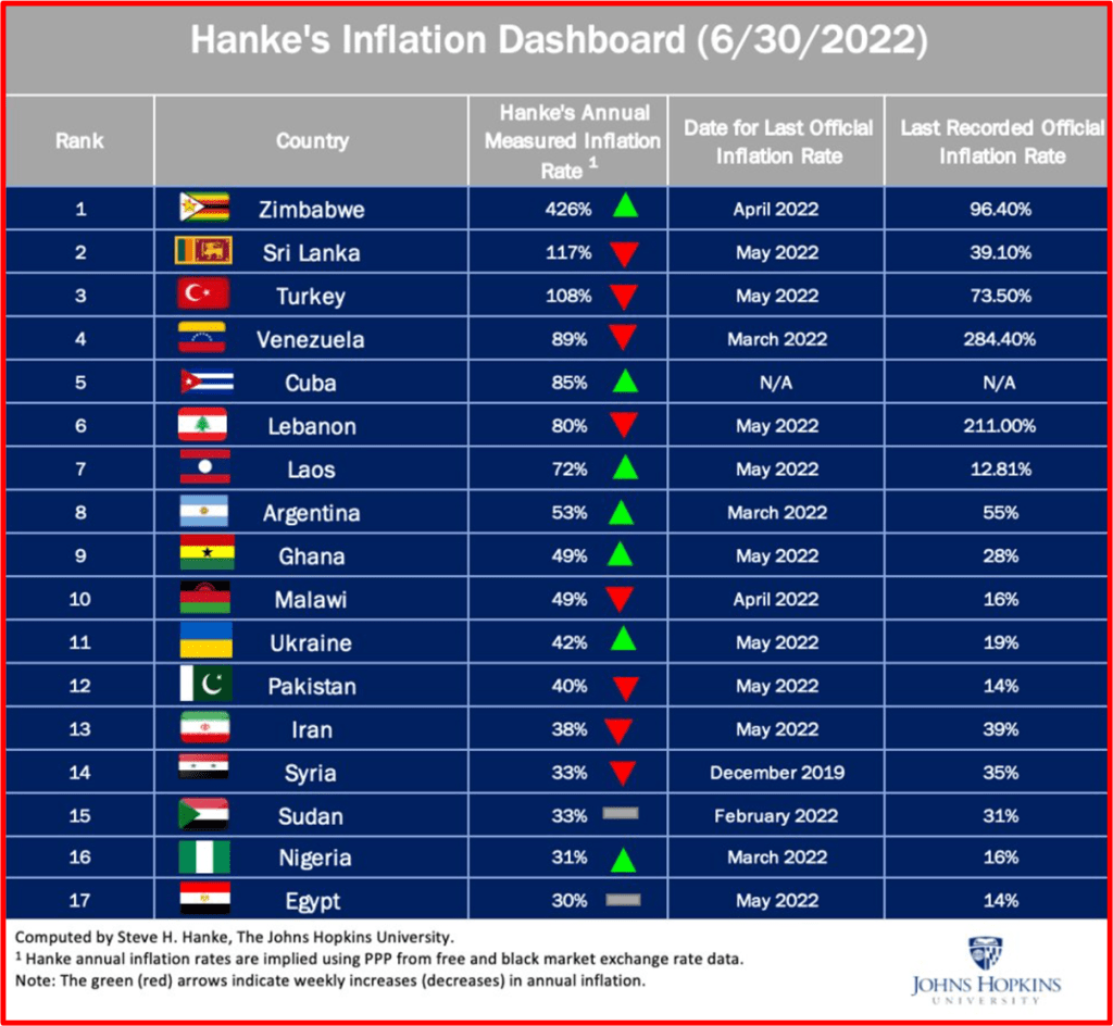 Besides the crash, which is explainable, there’s one other thing that troubles me. It’s about the slow uptake of Bitcoin around the world in these unprecedented inflationary times. This eye-popping inflation chart from economist Steve Henke shows how badly the corrupt and incompetent governments of nations around the world are debasing their currencies.