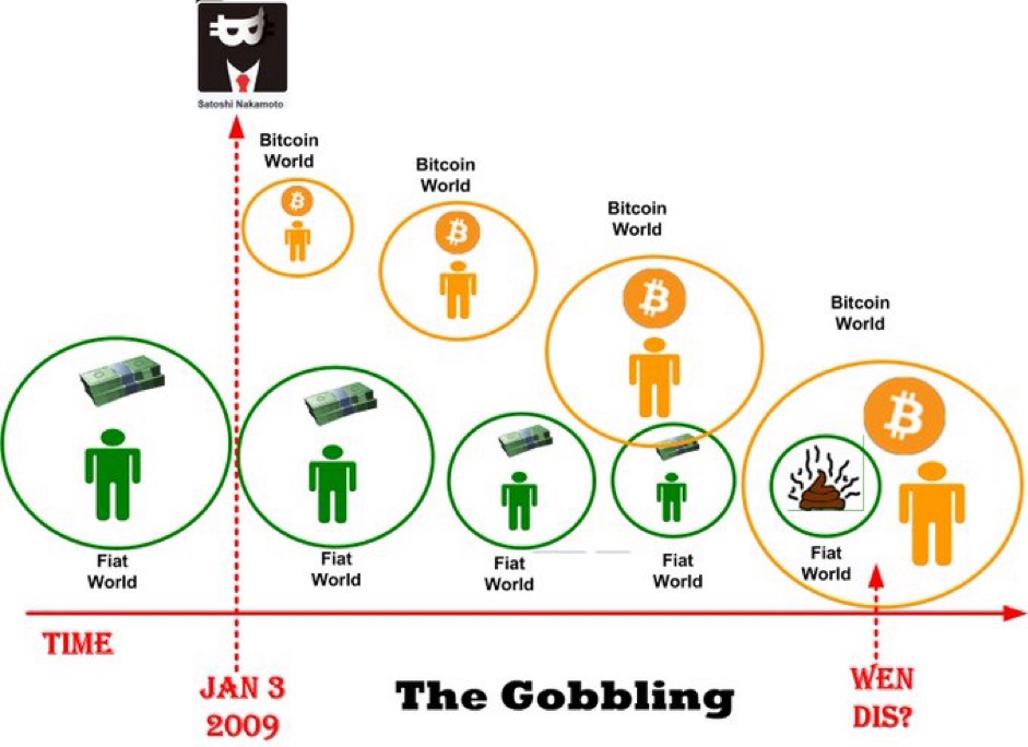 Fuggedaboud the next Bitcoin halving. As the figure below shows, I want to know when the gobbling is going to happen. We’re somewhere between the Bitcoin launch date and the gobbling, but I have no idea where. The end state is where all 160+ centralized fiat systems bend the knee to king Bitcoin.