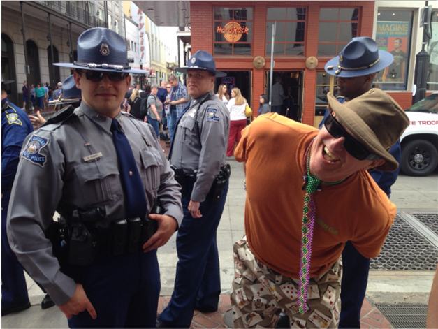 The Mardi Gras experience is difficult to describe to non-participants. It’s a time and place where 100s of thousands of people converge into one great big ball of intertwined happiness and generosity; and this includes the battalions of local and state police tasked to maintain a semblance of order amongst the cheerful, self-organized chaos.