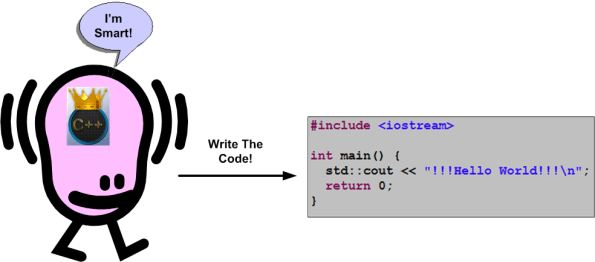 It’s natural to start from the bottom-up; learning how to program “hands on“. Thus, after learning our first language-specific constructs, we write our first “Hello World” program. We use M2C to dump our mind’s abstract content directly into a concrete main.cpp file via an automatic, effortless, Vulcan mind-meld process.