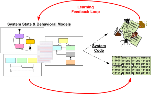 We learn how to capture these designs via a modeling tool(s) so we can use the concrete design artifacts as a memory aid and personal navigational map to code up, integrate, and test the program(s). The design artifacts also serve double duty as communication aid for others. Since our fragile minds are unreliable, and they don’t scale linearly, the larger the system (in terms of number of units, types of units, size of units, and number of unit-to-unit interfaces), the more imperative it is to capture these artifacts and keep them somewhat in synch with the fleeting images we are continuously munching on in our mind.