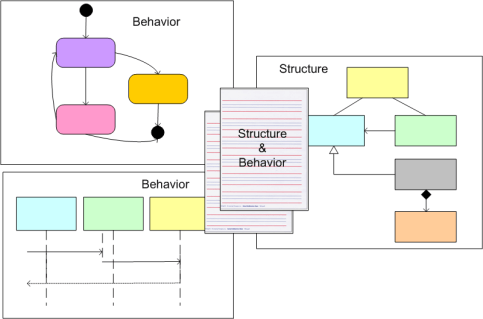 On the left side of the figure below, I show the four fundamental, visual UML symbols for conjuring up (wrong, incomplete, and inconsistent) structural views of an object-oriented software system in the form of class diagrams, deployment diagrams, component diagrams, etc.