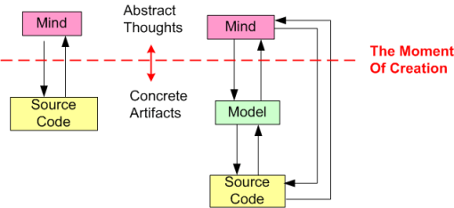 The figure below shows two methods of transcending the GOHI: direct mind-to-code (M2C), and indirect mind-to-model-to-source (M2M2C). The difference is that M2M2C is scale-able where as M2C is not. Note that both methods are iterative adventures.