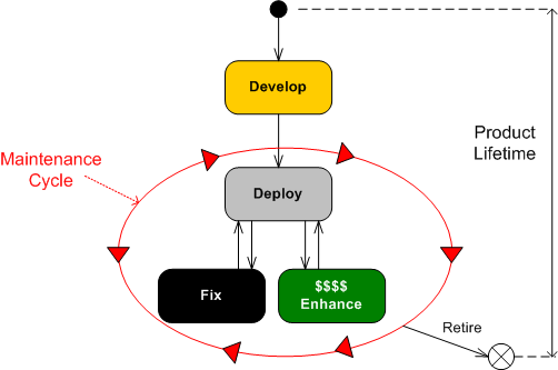 The UML state transition diagram below depicts the growth, maturity, and retirement of a large, software-intensive product. There are a bazillion known and unknown factors that influence the longevity and profitability of a system, but the greatest determinant is how effectively the work in the upfront “Develop” state is executed.