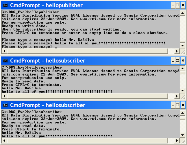 For grins, I opened a third console window and launched a second copy of HelloSubscriber.exe. The result is shown below.