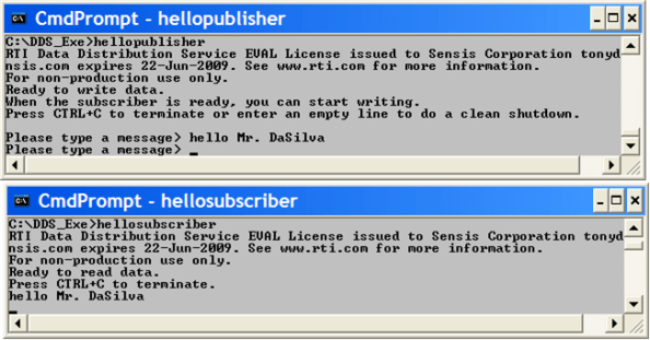 I opened two command console windows and launched the HelloPublisher.exe app in one window and the HelloSubscriber.exe app in the other. The figure below shows the window outputs after I typed in the message: “hello Mr. DaSilva“.