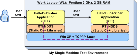 The simplest example application provided in the RTI distro is named Hello_Simple. I loaded the provided solution file into the MS Visual C++ 2008 Express IDE and built the 2 projects in the solution. At the completion of the build process, the following two 3MB executables were created: HelloPublisher.exe and HelloSubscriber.exe. The figure below shows the single machine test environment that I used to run the Hello_Simple application processes. For test purposes, I chose to statically link the DDS binary libraries with the application code.