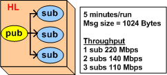 The figure below shows snapshots of the scrolling publisher and subscriber windows during runtime. For this specific snapshot, a 1024 byte message size was used and both the pub and sub application components were running on the same machine; hence the large 200+ Mbps throughput values.