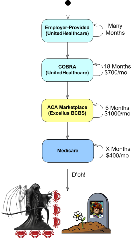 For completeness, I present to you my health insurance history in the form of an STD. No silly, I know what you are thinking and it’s not that (That’s twice I caught you thinking nasty thoughts). It’s a State Transition Diagram. A handy, but simple, tool I used for many years to understand the dynamic behavior of systems.