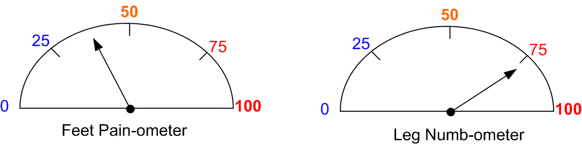 ….I present to you two brand new analog metering devices (patent pending) to employ in my anxiety-filled present and for my terror-filled future: the Pain-ometer and the Numb-ometer.