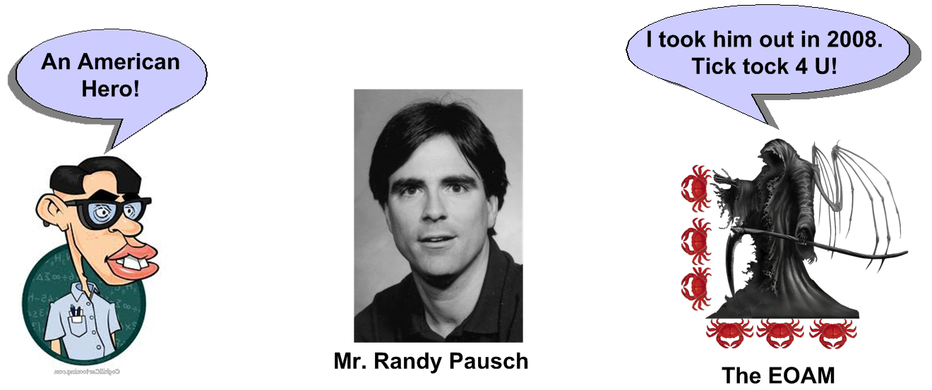 Besides the innate propensity to keep my potty mouth spewing verbal diarrhea, the top reason I’m writing about my walk down the proverbial plank is Randy Pausch. Randy was a computer science professor at a well known engineering school, Carnegie Mellon University. He was a victim of pancreatic cancer who succumbed to the EOAM‘s evil forces in 2008 at the age of 47.