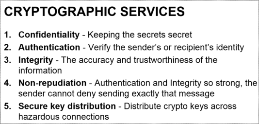 Depending on how they’re designed, there are up to 5 services that a cryptographic system can provide to its users: