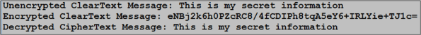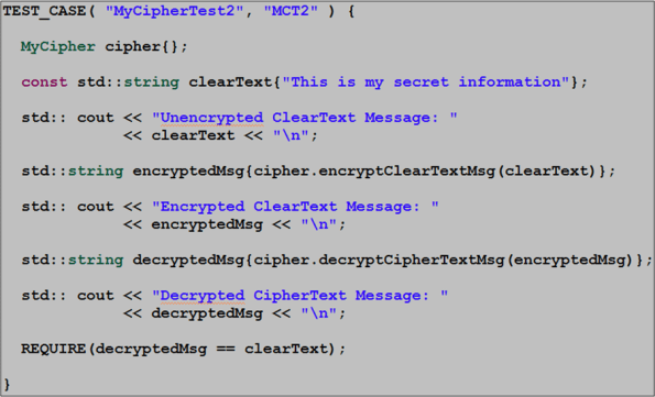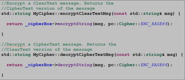 So, now that we have a matched CipherKey and Cipher object pair, let’s put them to use to encrypt/decrypt a ClearText message. As you can see below, the Poco.Crypto library makes the implementation of the MyCipher::encryptClearTextMsg() and MyCipher::decryptCipherTextMsg() member functions trivially simple.