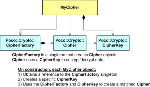 The design of the Poco.Crypto library requires users to create a CipherKey object directly, and then load the key into a Cipher acquired through a CipherFactory singleton.
