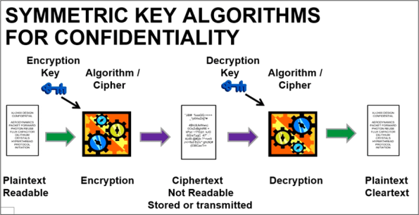 The figure below shows how a matched symmetric key/cipher pair provides the service of “confidentiality” to system users. Since they are “symmetric“, the encryption key is the same as the decryption key. Anyone with the key and matching cipher can decrypt a message (or file) that was encrypted with the same key/cipher pair.