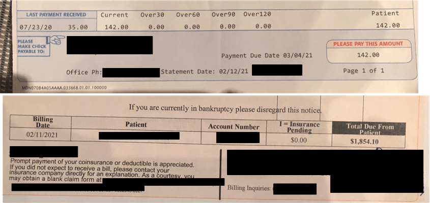 After navigating the dangerous waters between two health insurance transitions last year, I finally settled into using medicare for the duration to pay for healthcare services. Since I’m a well known “regular” patient to my cancer doctors, nurses, and CT/MRI imaging providers, you would think that their billing services wouldn’t screw up my bills anymore, right? Bzzzzzt, no, no. Observe the latest 2 redacted bills I just received in the mail: