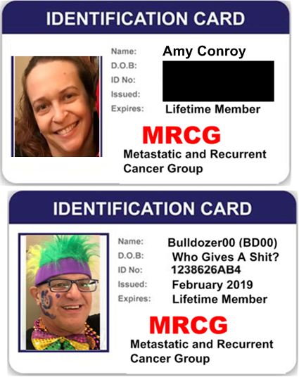 One of the deceased members of my MRCG (see formal ID cards below) was a scrappy fighter and a role model for our cancer caucus. Except for the inevitable final encounter with the infamous Emperor-Of-All-Maladies, Amy knew how to put a whuppin’ on the Emperor whenever he got too close. One of Amy’s many inspirational nuggets of wisdom is:
