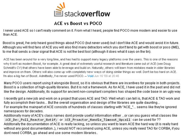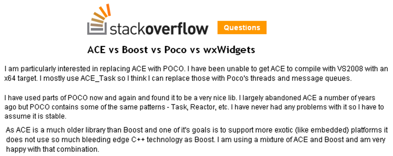 Note 1: If interested, check out this ACE vs Boost vs Poco libraries discussion on StackOverflow.com.