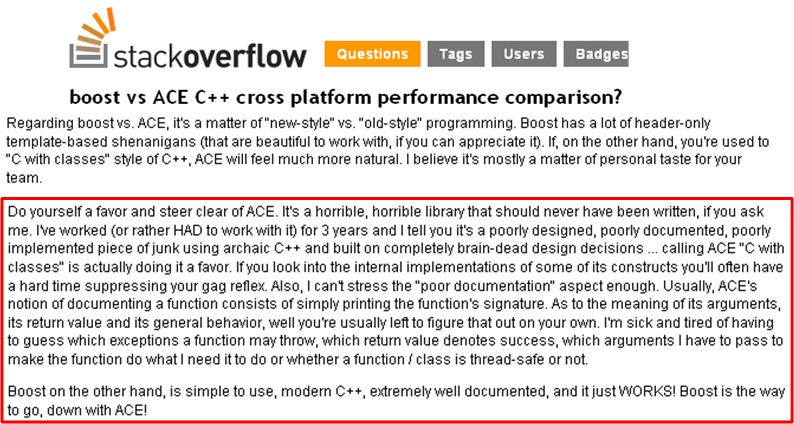 When other members of BD00’s team, including one member who directly used the ACE-based framework on a previous project, investigate the qualities of the framework, they come to the same conclusion: thank you, but for our project, we’ll roll our own lighter weight, more targeted, and more “modern” framework on top of Boost. But of course, BD00 is the only politically incorrect and blatantly over-the-top rejector of the intended one-size-fits-all framework. In predictable cause-effect fashion, the homegrown framework advocates dig their heels in against BD00’s technical criticisms and step up their “cost and time savings” rhetoric – including a diss against Boost in their internal marketing materials. Hmmm.