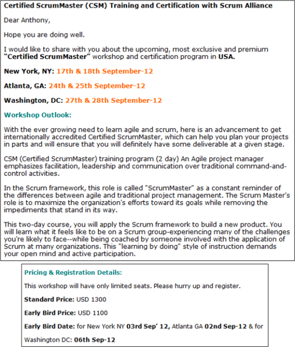 Hurry! Hurry! After just 2 days of effort and a measly 1300 beaners of “investment“, you’ll be fully prepared to lead your next software development project into the promised land of “under budget, on schedule, exceeds expectations“.