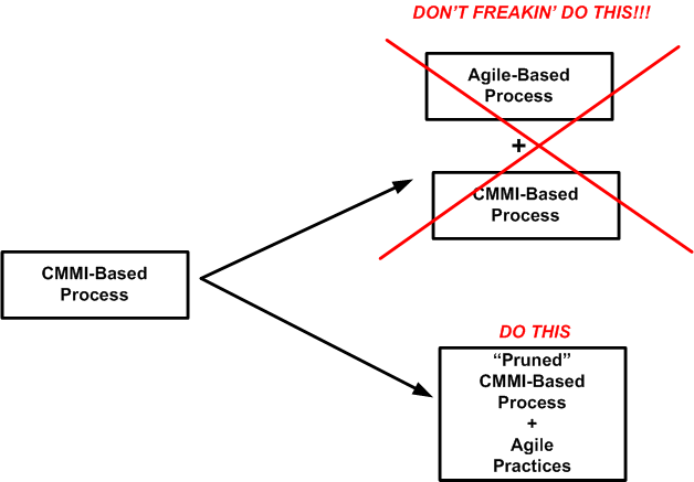 Because of its oxymoronic title, I started reading Paul McMahon’s “Integrating CMMI and Agile Development: Case Studies and Proven Techniques for Faster Performance Improvement“. For CMMI compliant orgs (Level >= 3) that wish to operate with more agility, Paul warns about the “pile it on” syndrome: