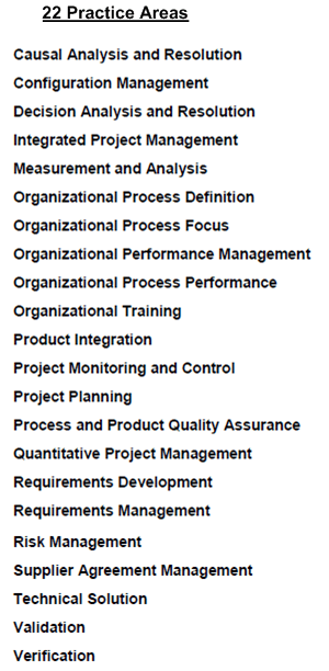 The CMMI-DEV model is comprised of 22 practice areas, each of which has a number of specific and generic practices. Goodly or badly, note that the word “practice” dominates the CMMI-DEV model.